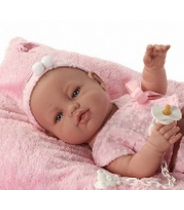 Deze Berbesa pasgeboren pop heeft een vriendelijk gezichtje, ze heeft echt zin in het leven! Ze heeft een roze pakje aan en roze sokjes met witte pompoentjes. Ze ligt heerlijk op het bijgeleverde fluweelzachte matrasje en heeft een speentje*.