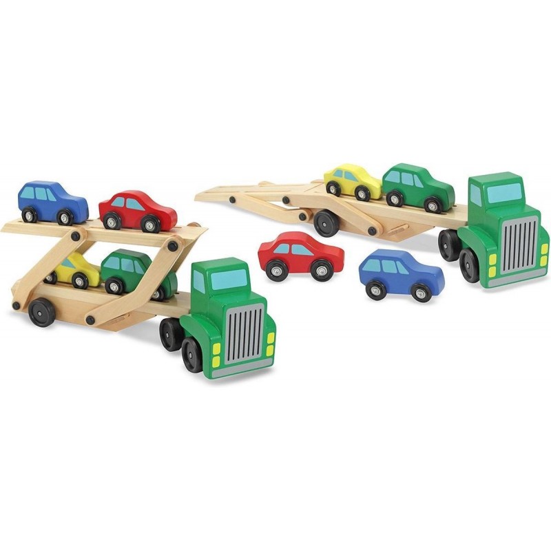 Met deze autotransportwagen kunnen vier kleurrijke auto’s tegelijk worden vervoerd. De opritten kunnen worden verlaagd voor het snel op twee niveaus laden van nieuwe voertuigen. Je kleine chauffeur gaat met de vlam in de pijp op weg in deze houten truck!