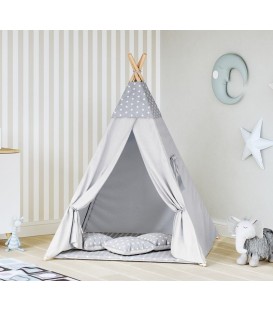 Speeltent Tipi grijs met wolkjes! Deze tipi speeltent is van goede kwaliteit en is lux uitgevoerd met een speelkleed en maar liefst 3 kussens.De tipi speeltent is eenvoudig te monteren en de stevige houten stokken worden in elkaar geklemd zodat de tipi tent na het spelen gemakkelijk is op te bergen.Door de grote van de speeltent kunnen er meerdere...