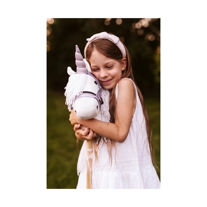 De witte stokpaard eenhoorn heeft lang haar, zodat kinderen de manen kunnen kammen en stylen met vlechten of misschien zelfs ‘rozenknopjes’. De stokpaard eenhoorn heeft een roze hoorn ( ook verkrijgbaar in Lila) en is een van de populairste fantasiedieren.