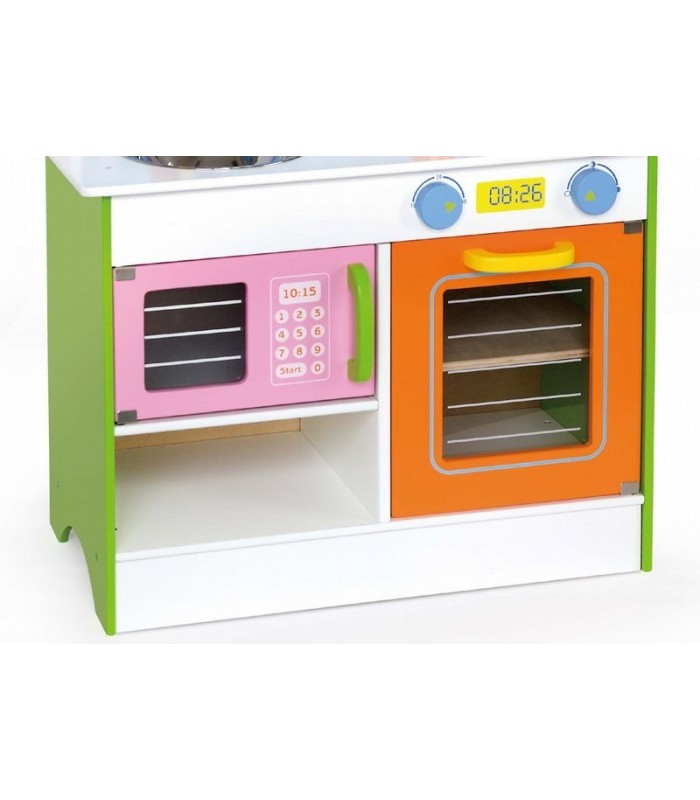 De keuken is in vrolijke kleuren en bestaat uit een aanrecht met uitneembare metalen spoelbak, een kraan, twee kookplaten, een oven, een afzuigkap, een klok en opbergruimte. Alle knoppen klikken als je er aan draait en het frame van de keuken is gemaakt van beukenhout wat zorgt voor een stabiele constructie!